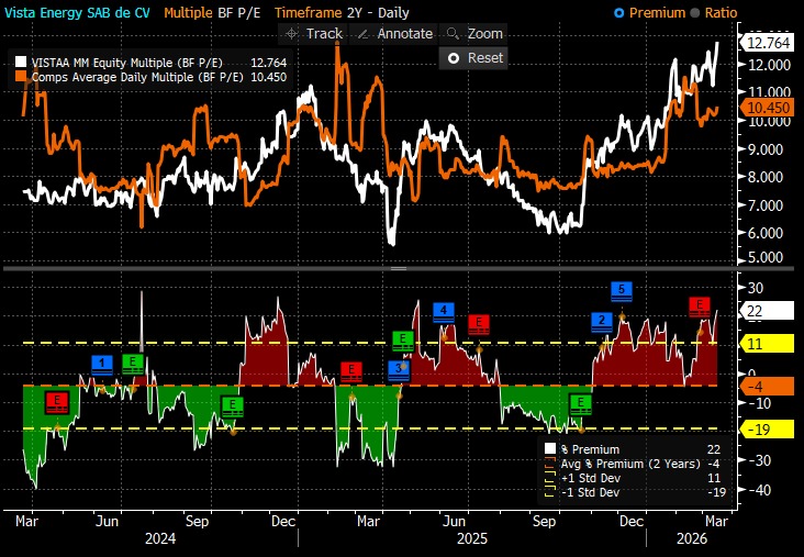 Con un precio actual de USD 68,75 y una market cap de USD 6.84B, Vista cotiza con una prima del 22% sobre sus comparables en Precio/Ganancias (P/E) y del 5% en EV/EBITDA. El EV total asciende a USD 9.64B, explicado en gran parte por una deuda bruta que escaló a USD 3.3B en 2025. Prácticamente se quintuplicó desde 2022 como producto del programa de crecimiento y expansión de su gasto en capital en Vaca Muerta.