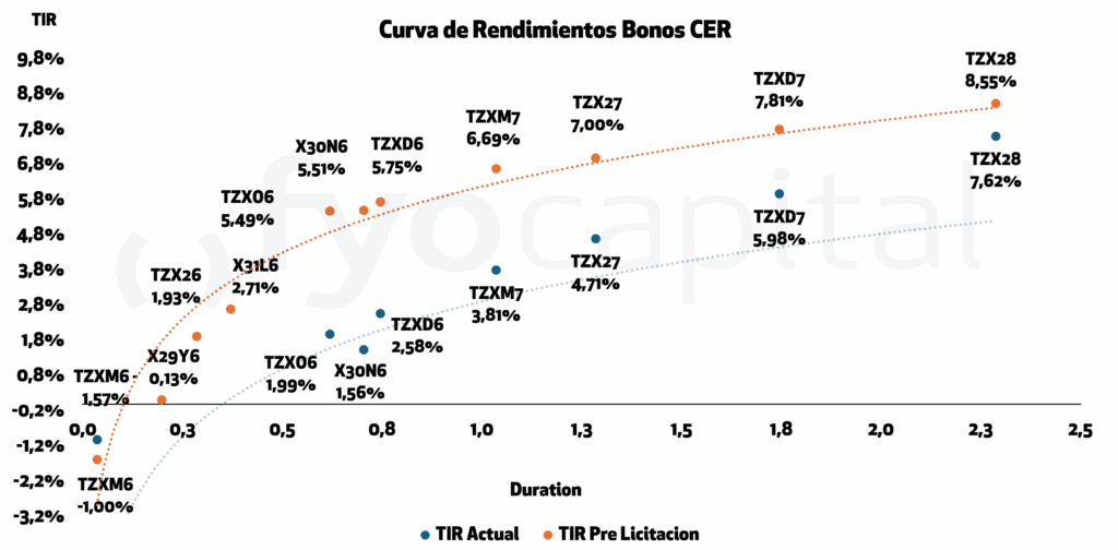 Por su parte, la curva CER, que ya venía comprimiendo, luego de la licitación confirmó su rumbo y operó las dos ruedas siguientes en verde quedando en la mayor parte de la curva en promedio 1,5 puntos porcentuales por debajo de los rendimientos previos a la licitación. Esta compresión se dio de forma mas fuerte en el tramo mas corto de la curva, hasta fines de este año, que pasó de rendir entre 0,1% y 5,75% previo a la licitación a rendir actualmente entre -5,5% y 2,8%.