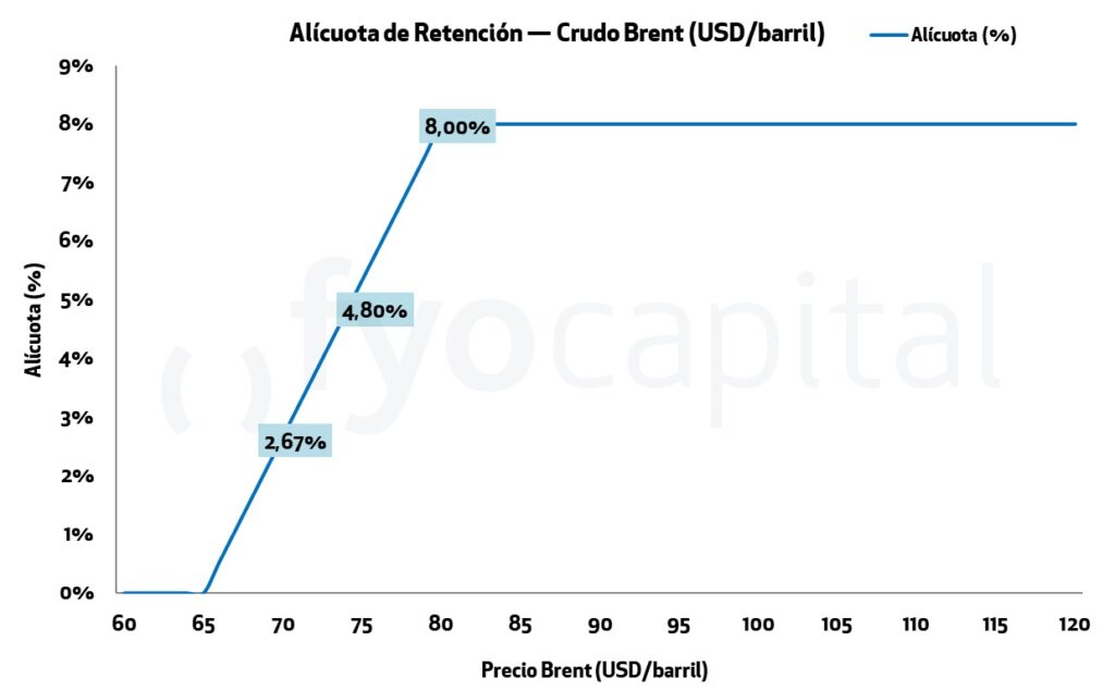 Tras el escalamiento del conflicto en Medio Oriente, el Brent superó los USD 100 con picos de USD 120, lo que activó el ajuste al techo máximo del 8%. El impacto alcanza a todos los productos incluidos en los decretos (crudo, solventes, naftas vírgenes y combustibles pesados), aunque no afecta al petróleo no convencional de Vaca Muerta, cuya alícuota se mantiene fija en 8% sobre el precio de exportación.