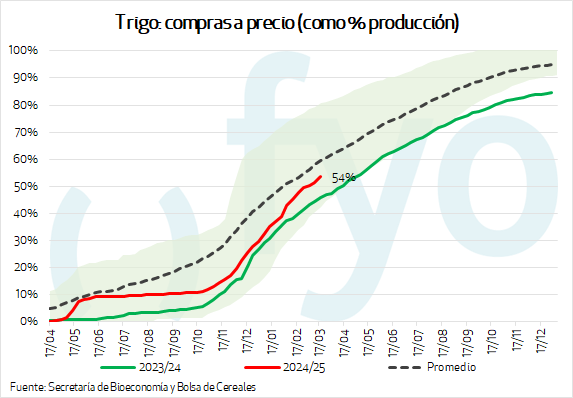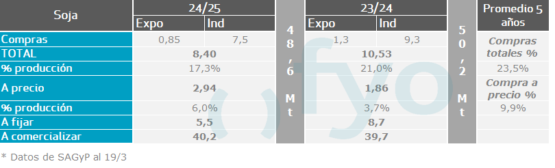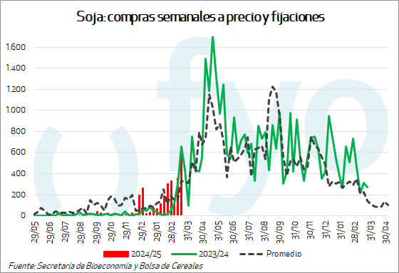 En la última semana relevada por SAGyP se le pusieron precio a unas 580.000 tt. de soja, lo que implica un record en lo que va de la campaña 2024/25, y acumula en total 2,95 Mt de soja negociada a precio. Esto representa el 6% de la producción, lo que nos continúa mostrando un atraso contra el promedio de cinco años, que es del 10%.