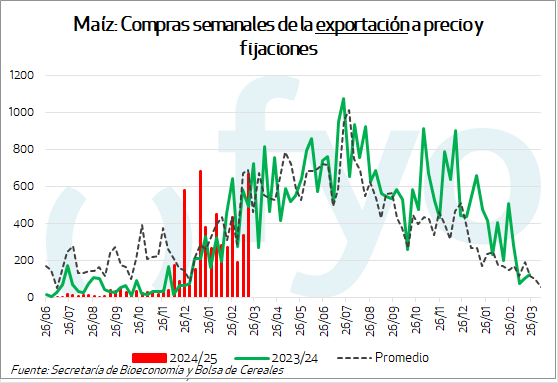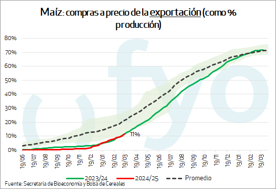 En cuanto al maíz, la última semana implicó la segunda de mayor volumen negociado a precio en lo que va de la campaña, con algo más de 660.000 tt. Con la cosecha ya avanzando firme, recién se le puso precio a 5,7 Mt, es decir, 11% de la producción, y también se muestra atrasada contra los promedios.