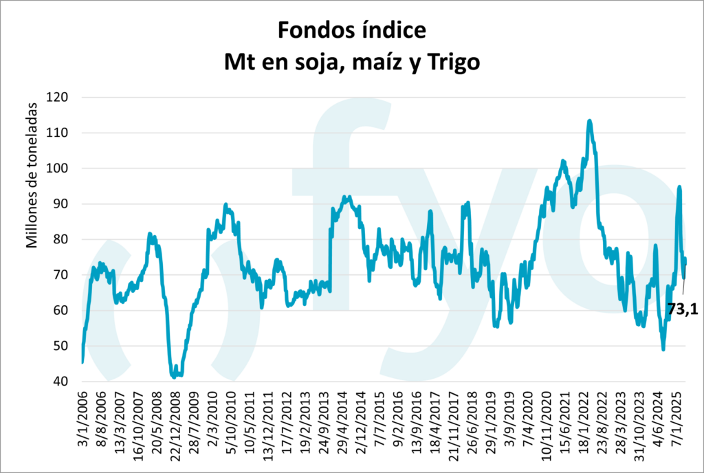 En el caso de la soja, prácticamente no hubo cambios en la posición neta, que totalizó una posición ligeramente compradora de 0,8 Mt. En cuanto al maíz, el comportamiento volvió a mostrar ventas netas, esta vez por 1,3 Mt, lo que resultó en una posición vendedora equivalente a 6,7 Mt en futuros y opciones. Para el trigo, se registraron ventas netas por el equivalente de 3,4 millones de toneladas, aunque cabe señalar que, históricamente, la posición neta de los fondos especulativos en este producto suele ser vendedora.