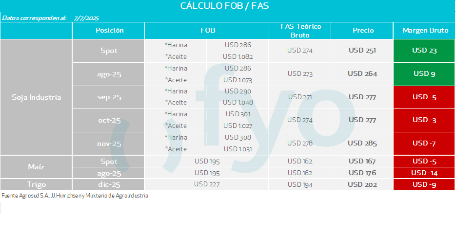 En el caso de la posición fábrica se parte de los precios FOB de los subproductos, luego se les aplica al valor del aceite, el porcentaje de rendimiento del poroto de soja para la extracción del mismo, y lo mismo en harina. Se suman estos valores, y se descuenta el costo de molienda estimado. El resultante es la capacidad teórica de la fábrica.