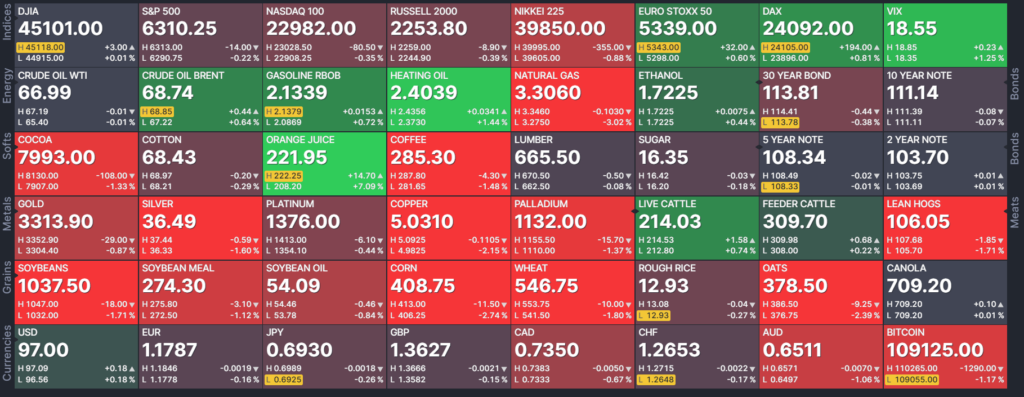 financieros bonos del tesoro de EEUU, bonos eurodollar, y tasas de la reserva federal de EEUU. Monedas índice dólar, libra, dólar canadiense, yen japonés, franco suizo,euro, dólar australiano, peso mejicano, dólar de Nueva Zelanda, rand de Sudáfrica y Rublo ruso.