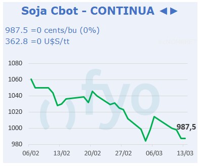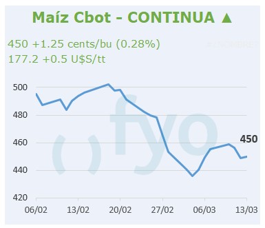 • Tras la caída de la ronda de ayer, con la noticia de que la Unión Europea le impondría aranceles a la importación de productos desde Estados Unidos a inicios de abril presionando Chicago, hoy los futuros recuperan.