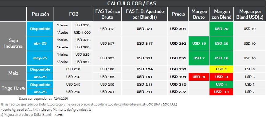 En el caso de la posición fábrica se parte de los precios FOB de los subproductos, luego se les aplica al valor del aceite, el porcentaje de rendimiento del poroto de soja para la extracción del mismo, y lo mismo en harina. Se suman estos valores, y se descuenta el costo de molienda estimado. El resultante es la capacidad teórica de la fábrica.