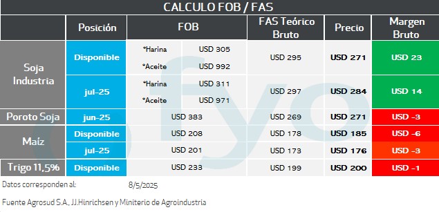 En el caso de la posición fábrica se parte de los precios FOB de los subproductos, luego se les aplica al valor del aceite, el porcentaje de rendimiento del poroto de soja para la extracción del mismo, y lo mismo en harina. Se suman estos valores, y se descuenta el costo de molienda estimado. El resultante es la capacidad teórica de la fábrica.