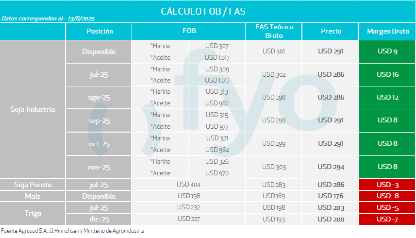 En el caso de la posición fábrica se parte de los precios FOB de los subproductos, luego se les aplica al valor del aceite, el porcentaje de rendimiento del poroto de soja para la extracción del mismo, y lo mismo en harina. Se suman estos valores, y se descuenta el costo de molienda estimado. El resultante es la capacidad teórica de la fábrica.