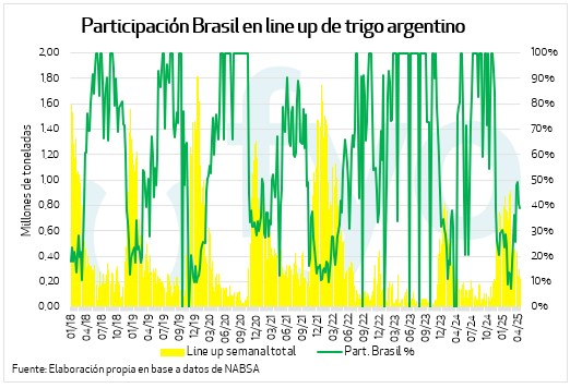 Por último, los compromisos de embarques de trigo continúan debajo de los valores promedios, alcanzando las 230.000 Tn, con 38% (90.000 Tn) destinadas a Brasil.