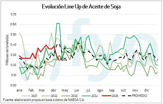 Respecto de los subproductos de soja, se observan descensos tanto en los compromisos de harina de soja como de aceite, finalizando ambos en niveles inferiores al promedio de los últimos años.