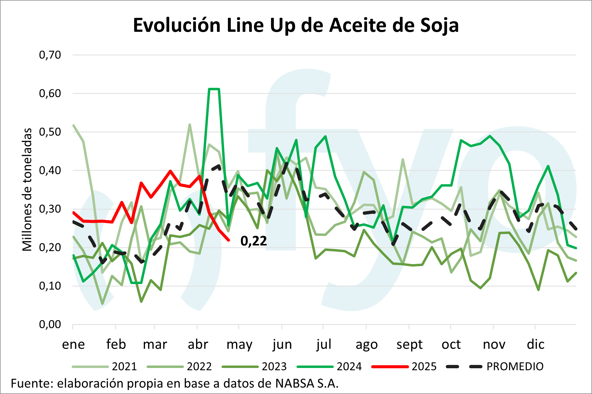 El programa de poroto de soja se encuentra en 680.000 toneladas, superando el promedio para esta fecha (400.000 t). En cuanto a los subproductos, el volumen programado es de 1,1 Mt de harina y 220.000 t de aceites; ambos valores se encuentran por debajo de los promedios.