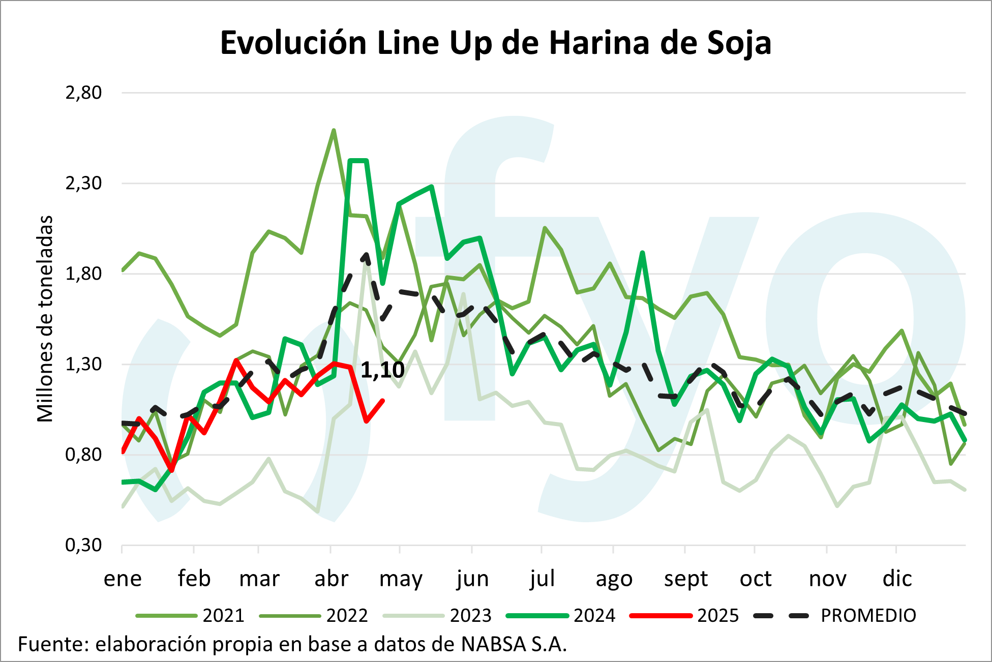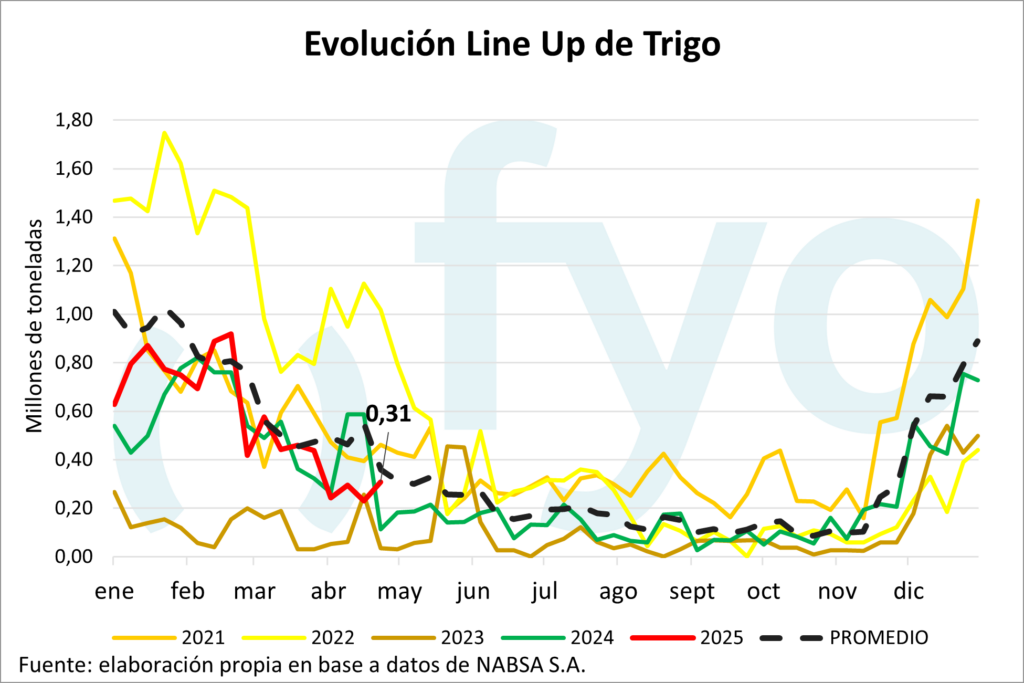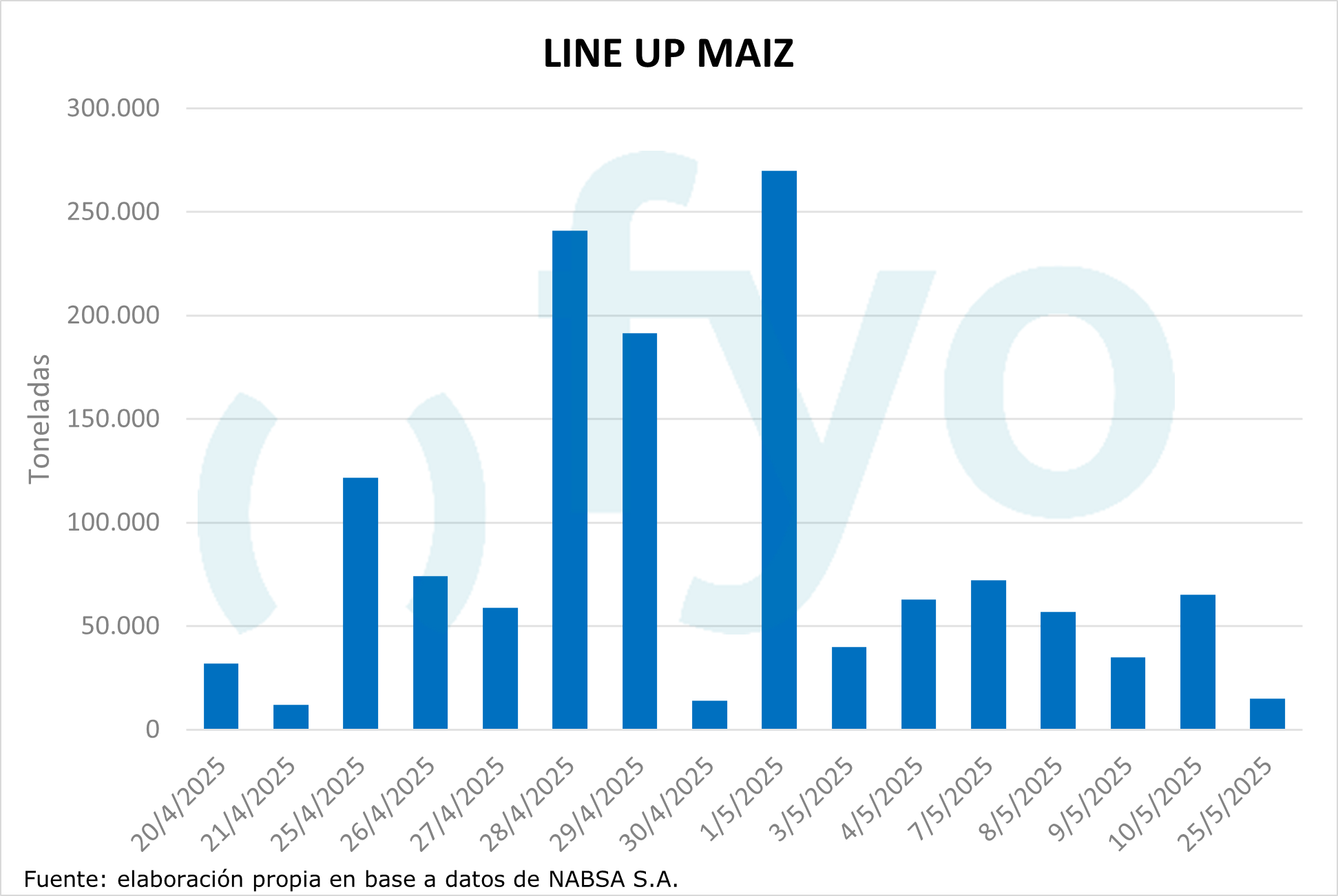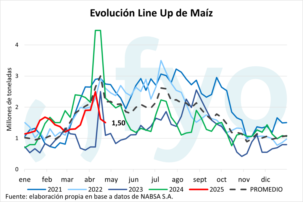 El line-up de maíz continúa desacelerándose, con un volumen de 1,5 Mt, por debajo del promedio de 2,2 Mt para esta época del año.