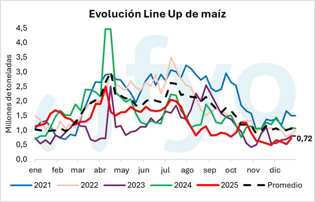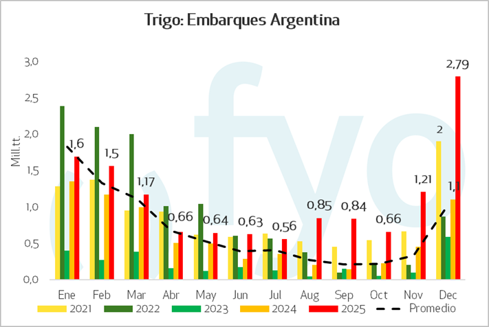 Con la cosecha prácticamente terminada, el país se consolida como un proveedor de bajo costo, garantizando un flujo constante de demanda externa exportaciones récord en diciembre). Y si bien la baja calidad (proteína) sigue siendo un desafío, los compromisos de embarque —principalmente trigo con 10,5% de proteína— ya superan las 1,8 Mt. Se observa un cambio en los destinos: Brasil pierde terreno (representando solo el 10% del total), mientras que la demanda de Vietnam e Indonesia crecen significativamente. En Rosario, los precios físicos mostraron una leve mejoría hasta USD180 reflejo de menor presión de cosecha.
