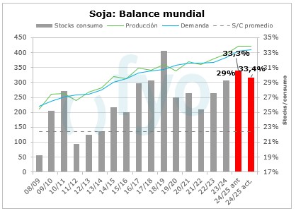 Respecto de Sudamérica, no hubo modificaciones para Brasil, sumando 1Mt de molienda para Argentina a ser cubierta por stocks. De esta forma el stock final para Argentina cae a 24,95 Mt.