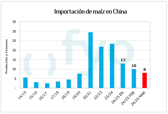 Por último, por segundo informe volvió a recortar la estimación de importaciones chinas. Al recorte de 3Mt de febrero, se suman 2Mt en marzo, dejandonos ante una proyección de 8 Mt de importaciones de maíz para China.