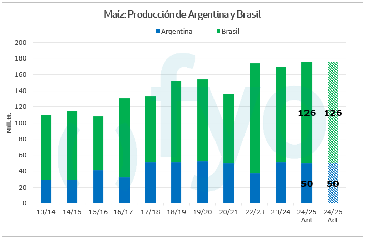 Para Sudamérica, si bien las estimaciones proyectaban un recorte de 1 Mt en la producción Argentina, el USDA mantuvo su proyección de 50 Mt. Para Brasil, si bien mantuvo la proyección de producción en 126 Mt, recortó 2 Mt las exportaciones, destinando solo 500.000 Tn a satisfacer un mayor consumo interno.