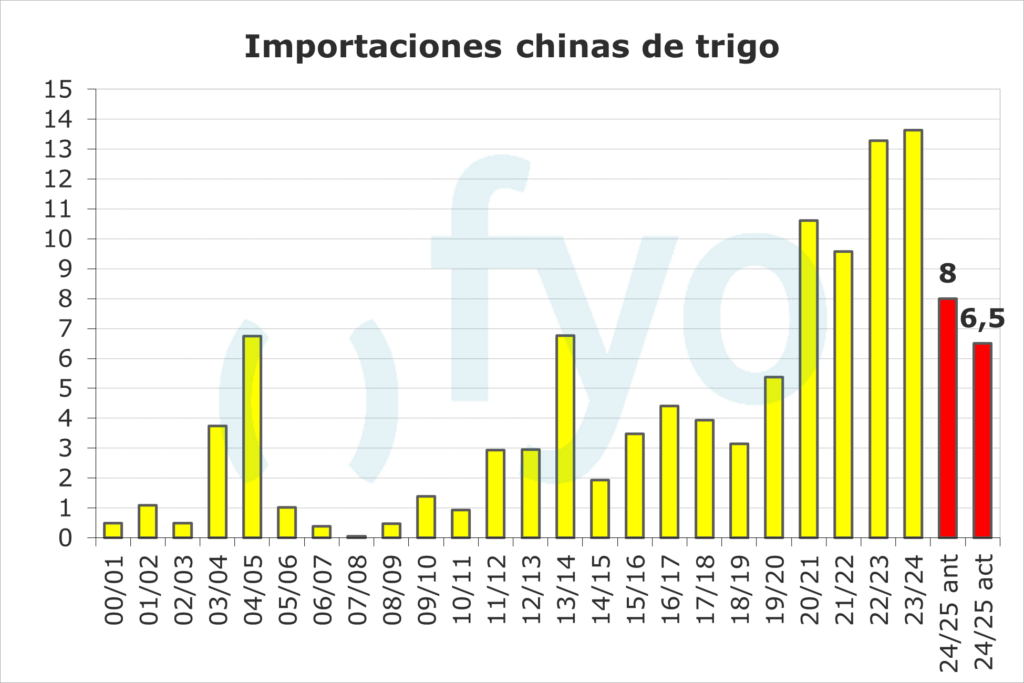 Por último, ajustó en 1,5 Mt las importaciones de trigo desde China, de esta forma, la producción récord que están mostrando les permitiría disminuir sus importaciones a 6,5 Mt.