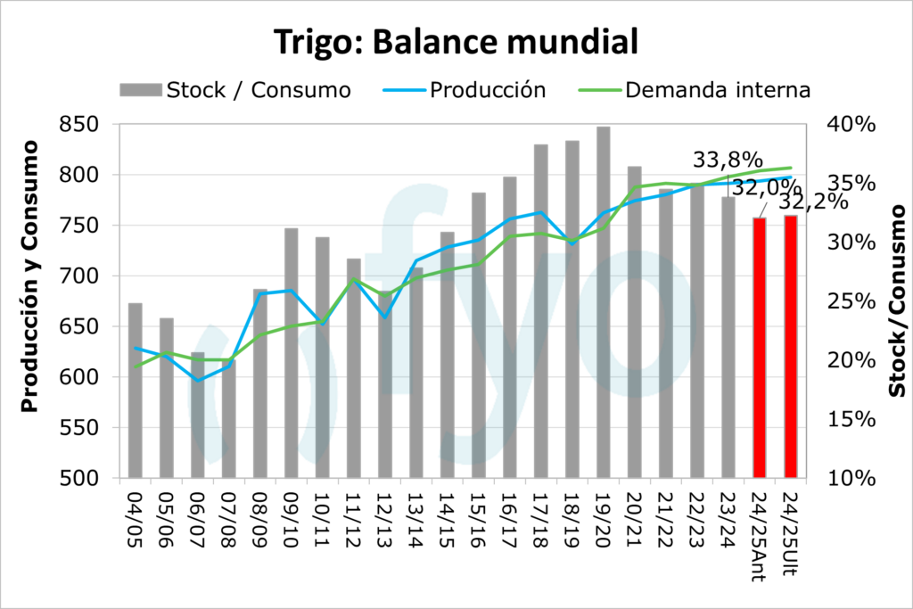 La hoja de balance mundial crece en stocks finales, pasando de 257,6 a 260,1 Mt.