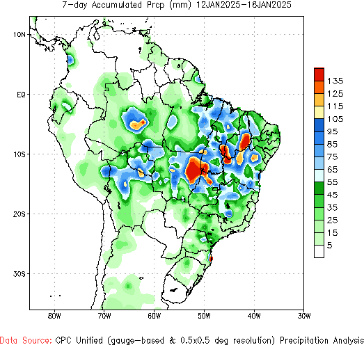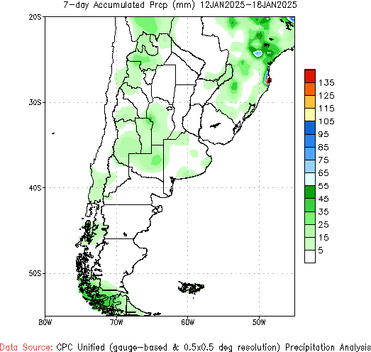 En el plano local, los mayores acumulados durante el sábado se registraron sobre Córdoba, San Luis, sur de Santiago del Estero, noroeste de Santa Fe y sudeste de Entre Ríos. El domingo se registraron nuevas lluvias importantes en el sudeste entrerriano y noreste y este de la provincia de Buenos Aires. En gran parte de la zona núcleo y oeste y sudoeste de Buenos Aires las precipitaciones fueron escasas.