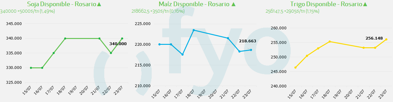 - Por fijaciones y por mercadería disponible se pagó $ 340.000 en Rosario, mejorando entre ruedas a pesar de un tipo de cambio estable, pero sin ser un valor que despierte grandes ventas del productor.