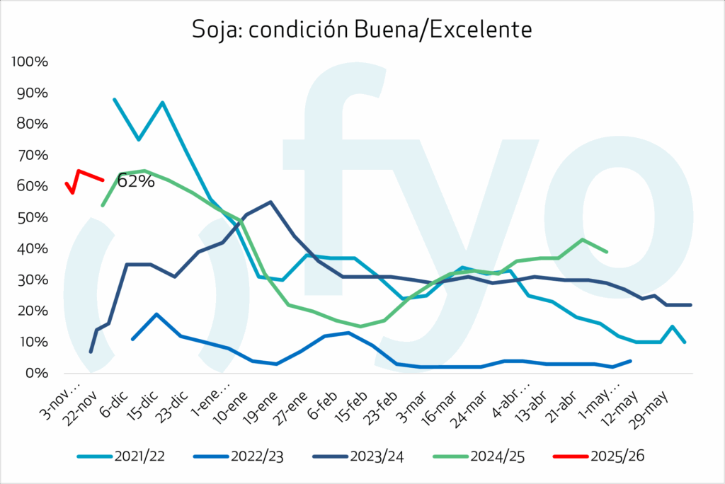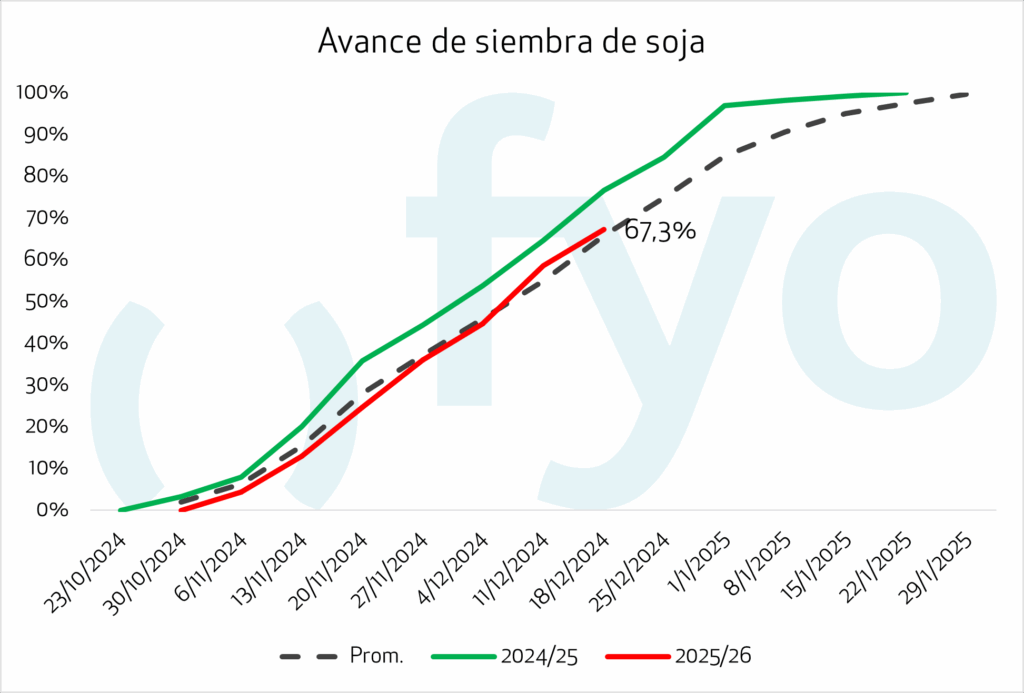 - La siembra de soja de primera entra en su fase final en el centro y sur, mientras que en el norte las labores ya cubren el 11 % de la intención.