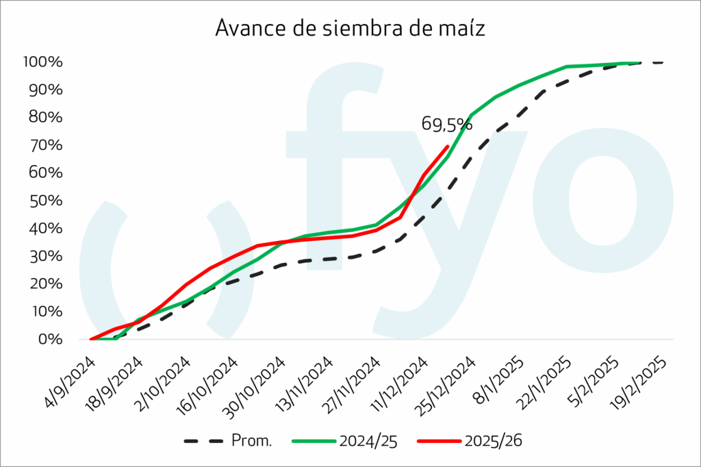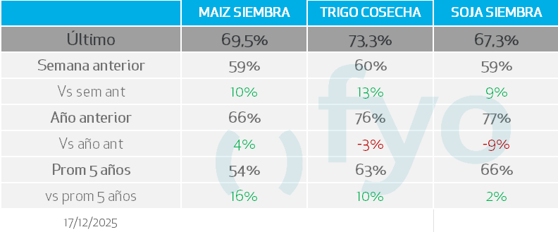 - El avance nacional de siembra es del 69,5 %, impulsado por las labores en la ventana tardía y el buen ritmo en los núcleos y el sur bonaerense.