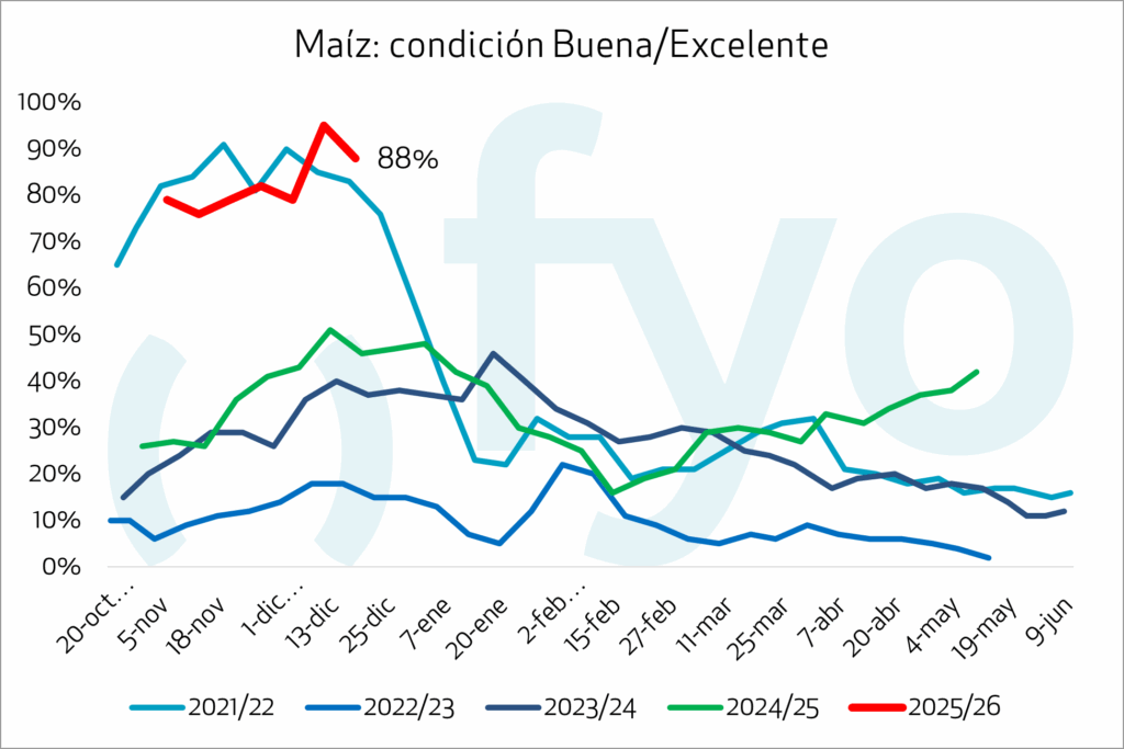 - El 21,8 % del maíz temprano transita su período crítico (VT-R1) bajo condiciones de humedad favorables.