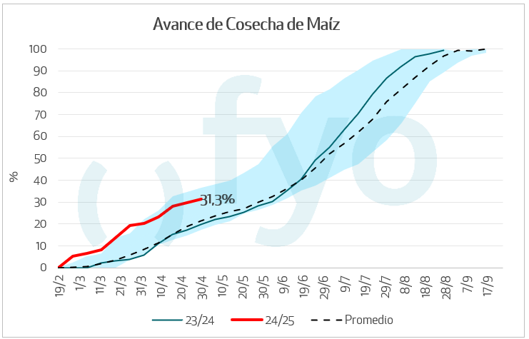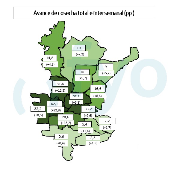 - Cosecha 31,3 %, avance semanal 1,6%.