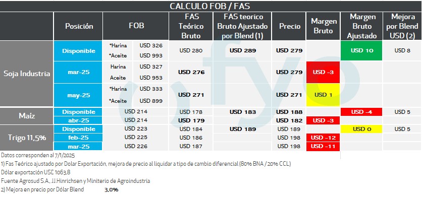 En el caso de la posición fábrica se parte de los precios FOB de los subproductos, luego se les aplica al valor del aceite, el porcentaje de rendimiento del poroto de soja para la extracción del mismo, y lo mismo en harina. Se suman estos valores, y se descuenta el costo de molienda estimado. El resultante es la capacidad teórica de la fábrica.