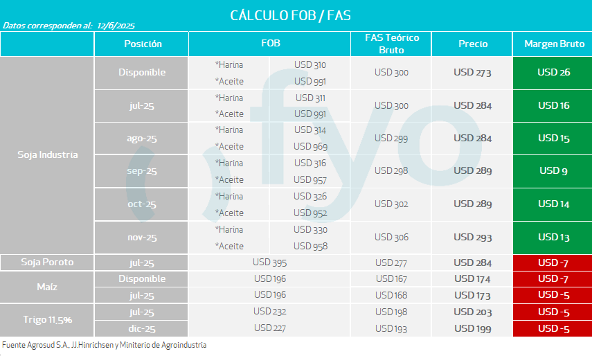 En el caso de la posición fábrica se parte de los precios FOB de los subproductos, luego se les aplica al valor del aceite, el porcentaje de rendimiento del poroto de soja para la extracción del mismo, y lo mismo en harina. Se suman estos valores, y se descuenta el costo de molienda estimado. El resultante es la capacidad teórica de la fábrica.