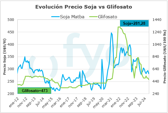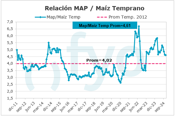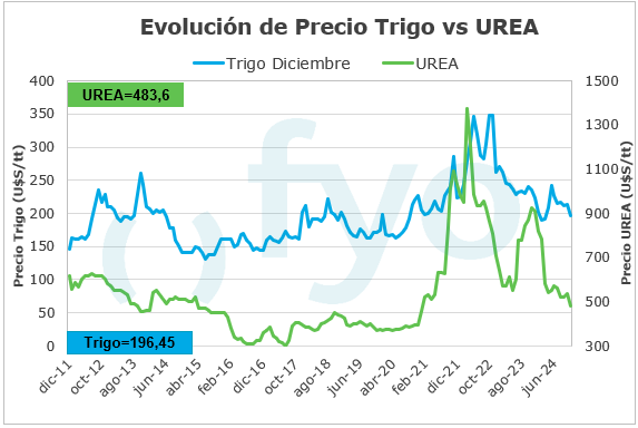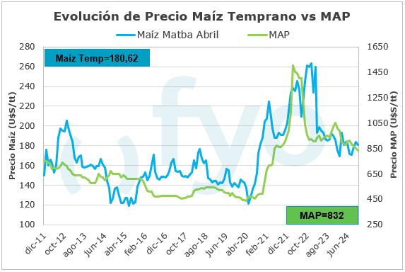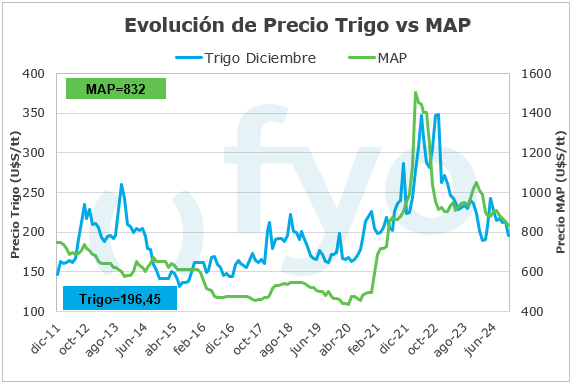 El cálculo de las relaciones Insumo/Producto para la elaboración del siguiente informe se realiza a partir de los precios actuales en dólares de los insumos y el precio promedio registrado durante el mes de agosto en el MATBA-Rofex para las posiciones: Dic-24 para trigo, Abr-25 para maíz y May-25 para soja.