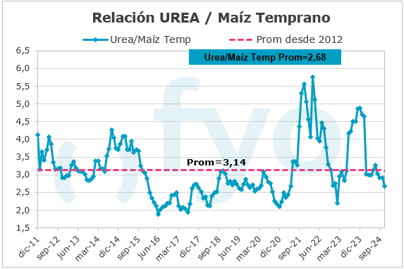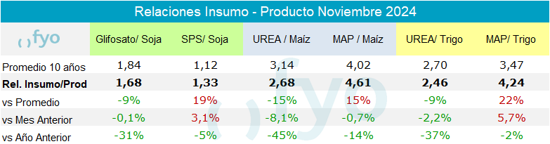 En el mes de noviembre, las relaciones insumo-producto volvieron a mostrar un comportamiento dispar. Mientras los precios de los granos se mantuvieron a la baja, algunos insumos también continuaron con esta tendencia, destacándose los menores precios de la urea.