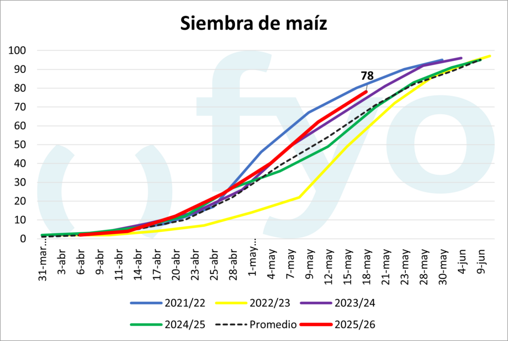 La siembra de maíz avanzó 16 puntos porcentuales, alcanzando el 78 % del área estimada, por encima del promedio del 73 %.
