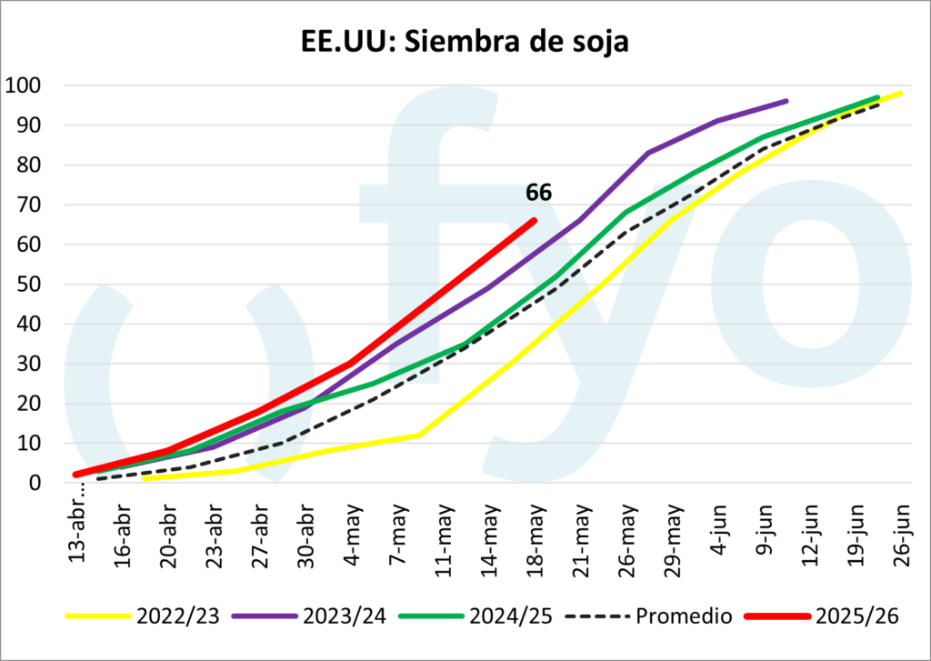 La siembra de soja alcanzó el 66 %, un punto por encima de lo previsto. A su vez, este dato se ubica por encima del promedio de los últimos cinco años (53 %).