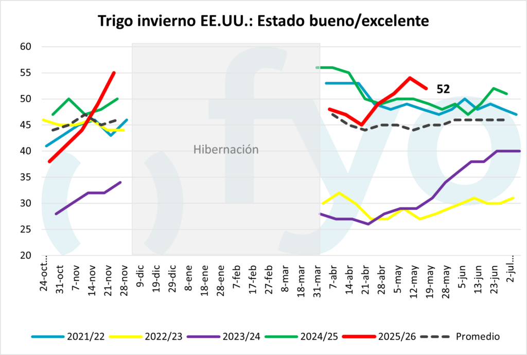 El trigo de invierno se encuentra en condición buena/excelente en el 52 % del área, lo que representa una caída de 2 puntos porcentuales e inferior las expectativas del 51 %.