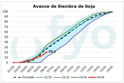 - Avance nacional de siembra de soja se eleva al 20,1% (+12,2 p.p.), adelantada respecto de la camapaña anterior 2,4 p.p.