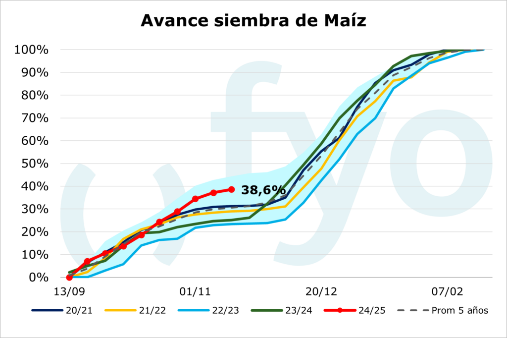 - Con un avance nacional de la siembra que se ubicó en 38,6 %, (+1,4 pp), solo restarían lotes del sur del área agrícola.