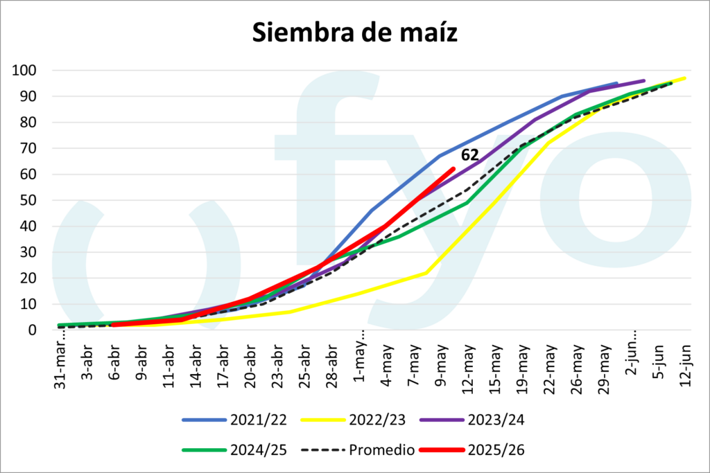 La siembra de maíz avanzó 22 puntos porcentuales, alcanzando el 62 % del área estimada, por encima del promedio del 56 %.