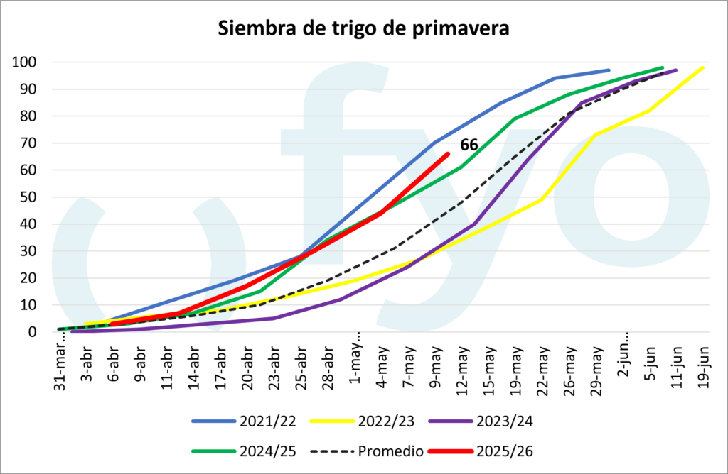 Por su parte, la siembra de trigo de primavera avanzó hasta el 66 %, por encima del promedio (49 %).