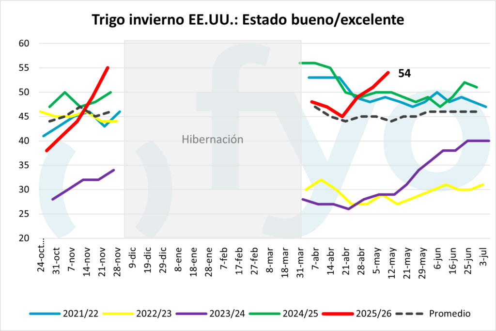 El trigo de invierno se encuentra en condición buena/excelente en el 54 % del área, lo que representa una mejora de 3 puntos porcentuales y supera las expectativas del 51 %.