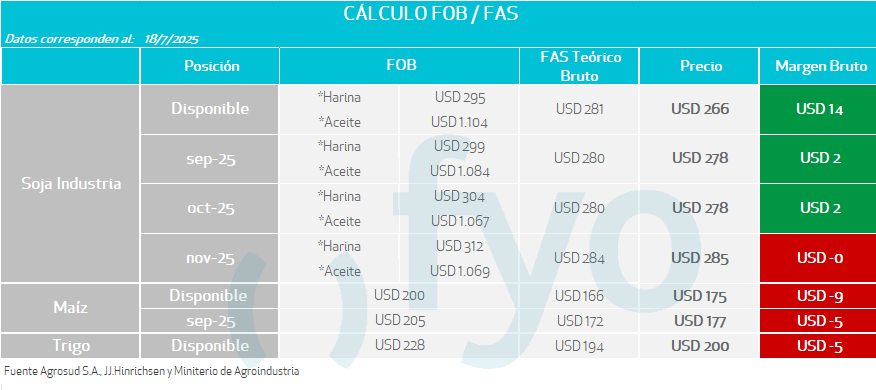 En el caso de la posición fábrica se parte de los precios FOB de los subproductos, luego se les aplica al valor del aceite, el porcentaje de rendimiento del poroto de soja para la extracción del mismo, y lo mismo en harina. Se suman estos valores, y se descuenta el costo de molienda estimado. El resultante es la capacidad teórica de la fábrica.
