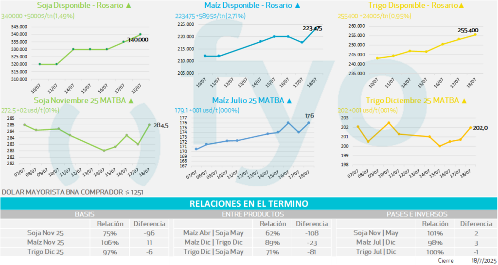 Granos maíz, trigo, soja, harina de soja, aceite de soja, cebada, arroz, trigo y canola.