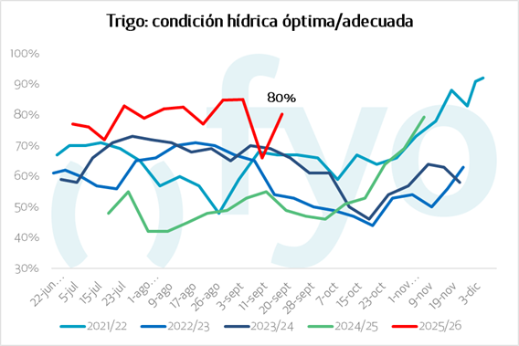 • El 80,2% del área presenta una condición hídrica Óptima/Adecuada, reflejando una mejora tras una semana sin lluvias que redujo en 17,1 pp. la superficie con excesos hídricos.