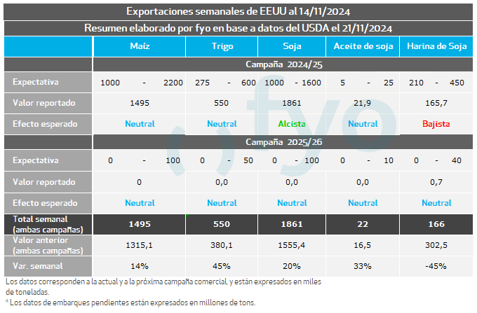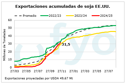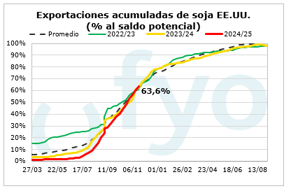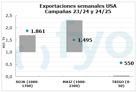 Las ventas de soja fueron sólidas acumulando 1,8 Mt y ubicándose por encima de las expectativas del mercado. China ha comprado 14,7 Mt de soja estadounidense en lo que va de año, 1,4 Mt más que el año pasado.
