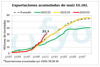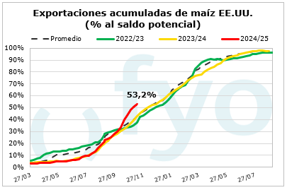 Las ventas de exportación de maíz de EE. UU. para la semana finalizada el 14/11 acumularon 1,4 Mt, en línea con lo esperado por el mercado, y comparables a las ventas de la misma semana del año pasado. El acumulado de exportaciones de EE.UU. en la campaña alcanza 31,3 Mt, el 53% del saldo exportable. Esto se ubica muy por encima de años previos, y genera dudas sobre si podría darse una corrección al alza en el objetivo de exportación del USDA en su próximo informe de Oferta y Demanda Mundial.