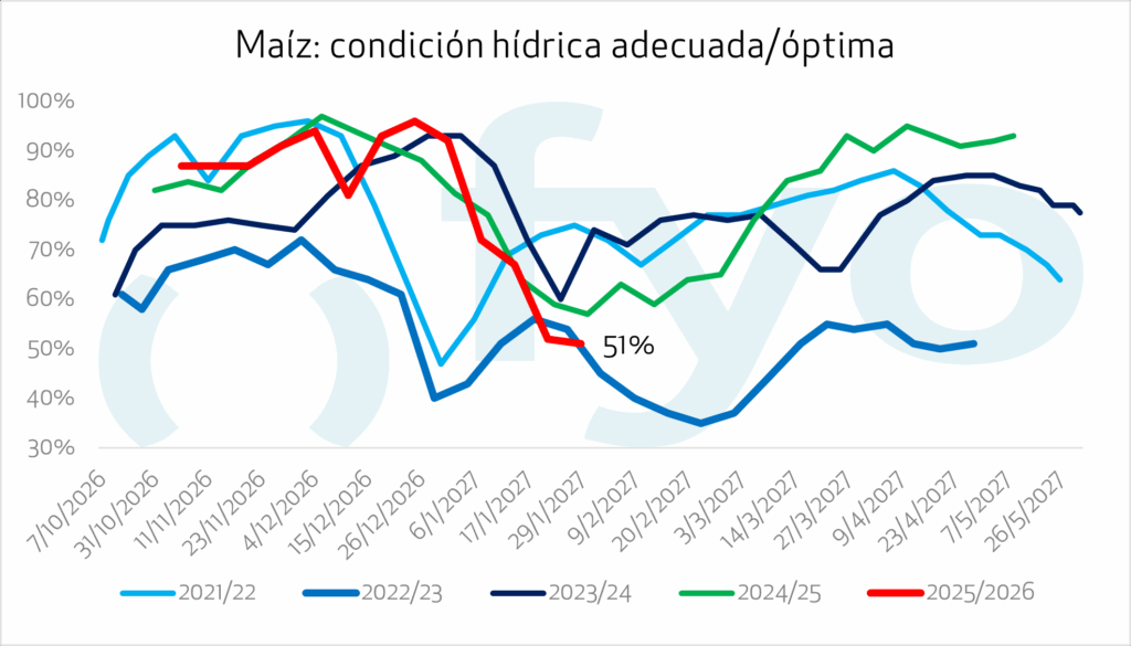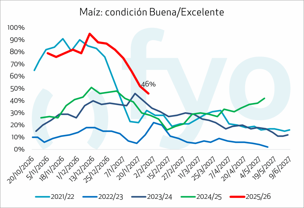 - El NEA y Córdoba registran rendimientos superiores a sus máximos históricos, mientras que en el sur la falta de lluvias durante el último mes afecta negativamente la condición Buena/Excelente y las expectativas de cosecha.