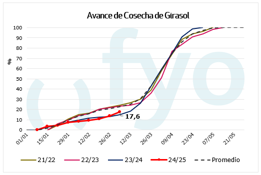 - La cosecha de girasol cubre el 17,6 % del área apta, luego de un progreso intersemanal de 3,8%. La demora en la cosecha es del 21,9% en comparación al promedio de los últimos 5 años y de 8,7% respecto al ciclo previo.