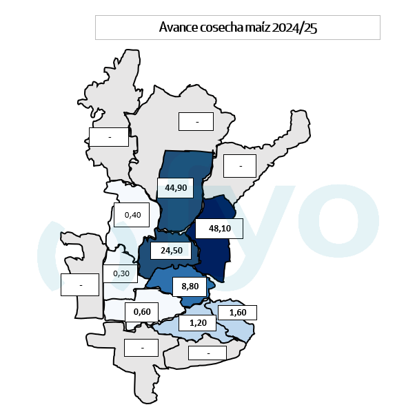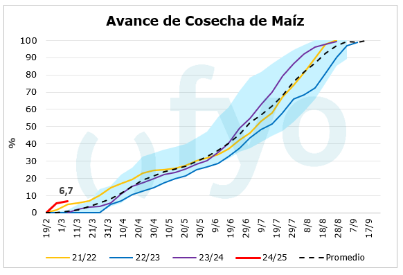 - Producto de las lluvias, el avance semanal en la cosecha de maíz fue solo 1,3% alcanzando así el 6,7 % del área estimada.