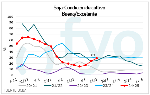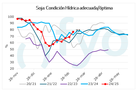 - 77% de la soja presenta condiciones Normal – Excelente, una mejora semanal de 6,4%.