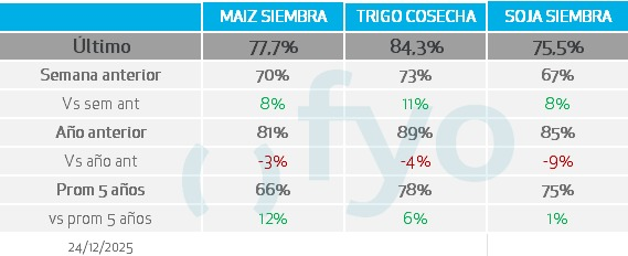- El avance nacional de cosecha es del 5 % del área apta, concentrándose la actividad en la región NEA con un rinde zonal de 22,8 qq/Ha.